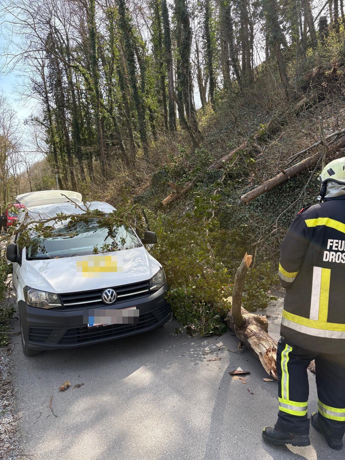Am 06.04.2026 wurden die Freiwillige Feuerwehr Drosendorf sowie die FF Wolfsbach zu einem Sturmschaden auf einer Gemeindestraße im Stadtgebiet alarmiert. Ein Baum war infolge des starken Windes umgestürzt und traf ein vorbeifahrendes Fahrzeug.